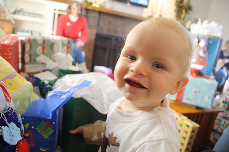 We spent Christmas eve with My family in Bloomington. We had a really nice time eating yummy food, and spending some quality time with my parents and Grandparents. We opened presents and Charlie was very spoiled. He got some really cute clothes from his Great Grandparents, and some really neat toys from his Grandparents. My dad made Charlie a beautiful rocking horse, and a really neat music drum box. Here are some pictures...